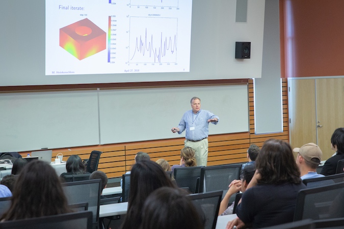 Keynote speaker Professor Matthias Heinkenschloss — the Noah G. Harding chair in the Department of Computational and Applied Mathematics at Rice University — delivered a talk called the “Optimization of Engineering Systems Modeled by Partial Differential Equations (PDEs)” to a capacity crowd in one of largest lecture halls in Classroom and Office Building 2. The seminar focused on how optimization techniques and PDEs can be used to improve efficiency in engineered systems, from managing underground oil reservoirs to finding the best shapes for musical instruments.